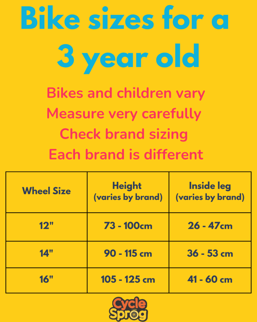 Most 3 year olds will need a 12" or 14" wheel bike, but some taller 3 year olds, especially those who are approaching their 4th birthday, may need a larger 16" wheel bike.